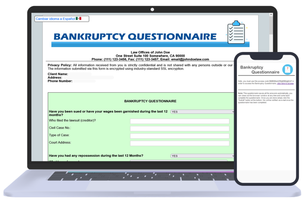 Get all the answers you need to complete the bankruptcy petition and schedules with our integrated bankruptcy questionnaire. Simply, e-mail the questionnaire to your client(s) where they can access it securely.