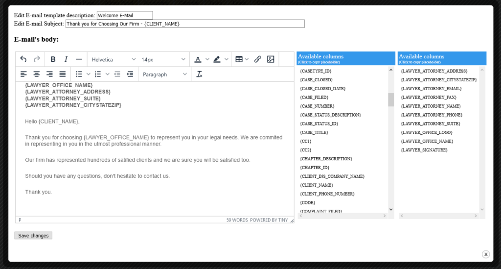 Having to re-type e-mails over and over again can be tedious and time consuming. Our software allows you to create e-mail templates from scratch using placeholders, these placeholders take saved data from within the system replacing it with information such as the client’s name, address, case number, etc. thereby saving you precious time by not having to re-type the same information again and again.